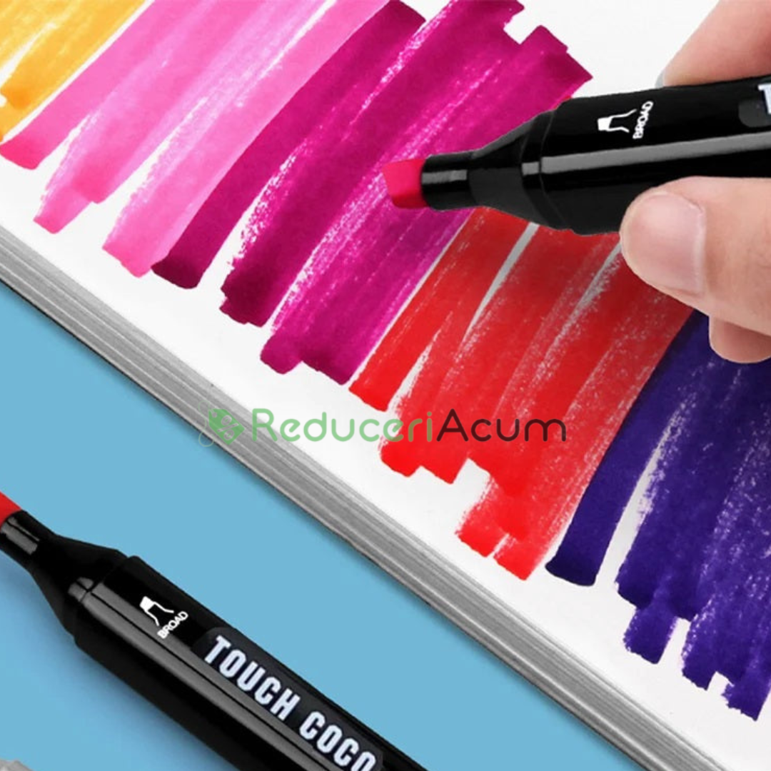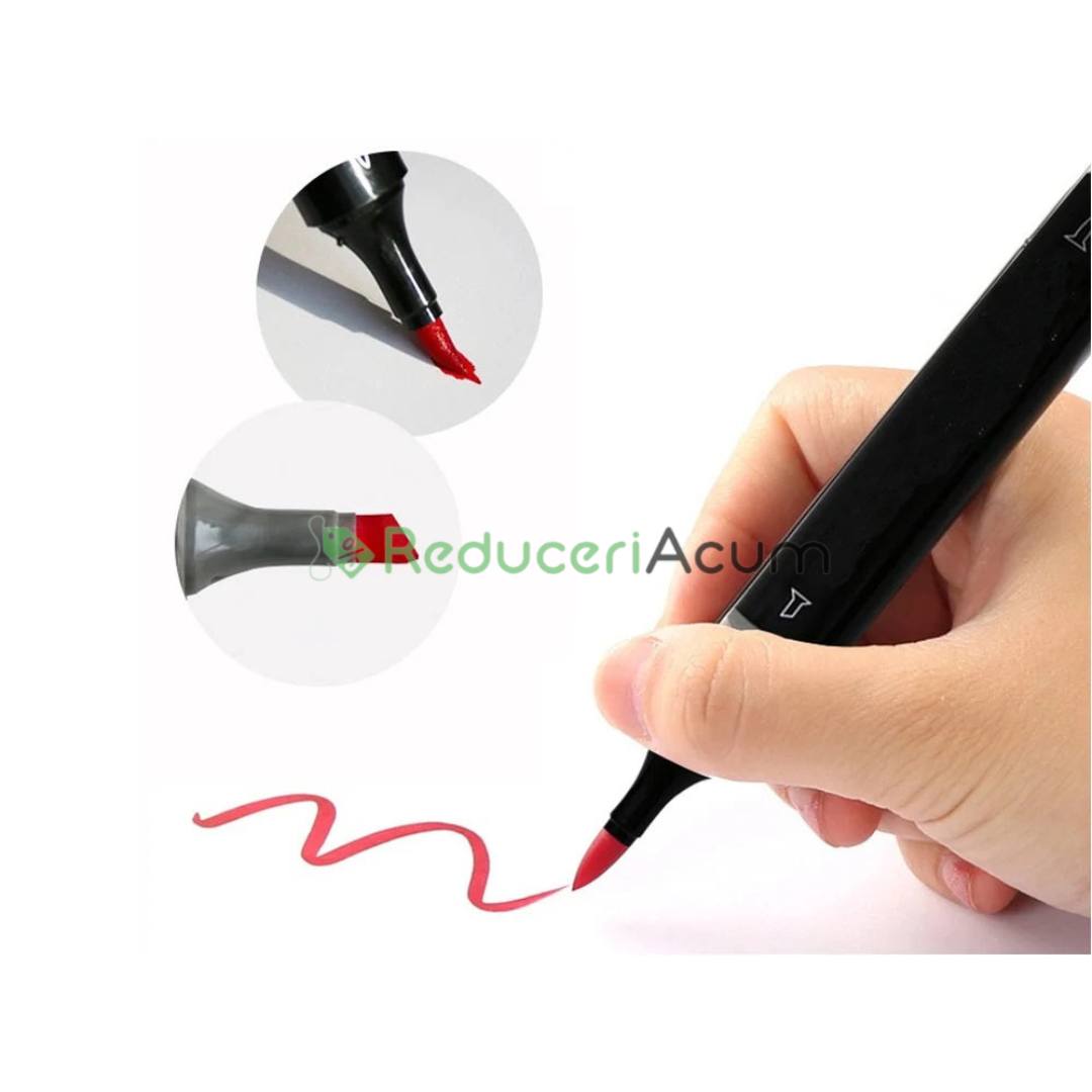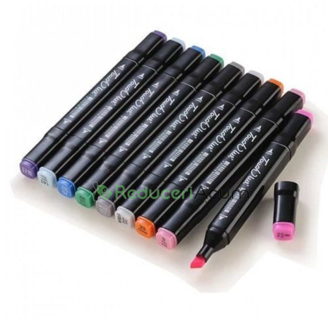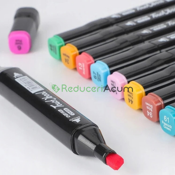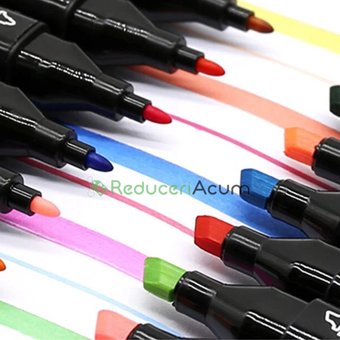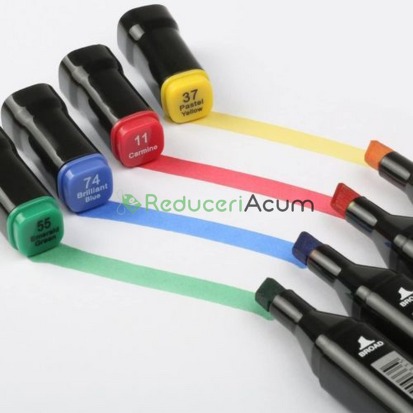 Markerele sunt ideale pentru diferite postere, schite, ilustratii, carti de colorat sau pentru sublinierea diferitelor informatii. Fiecare marker este prevazut cu 2 varfuri: unul subtire pentru scris si unul lat pentru subliniat. Culorile sunt non toxice si sunt construite pentru a rezista impotriva decolorarii.