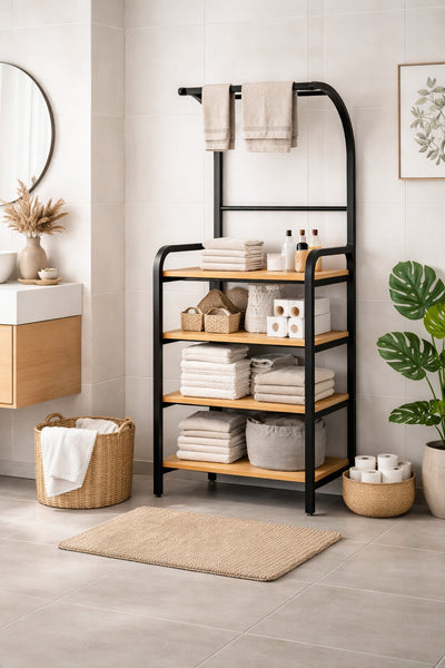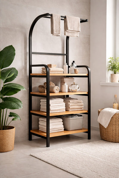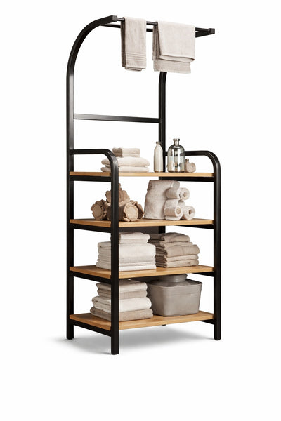 Etajera de baie metalică cu suport de prosoape și rafturi din lemn este soluția ideală pentru o baie organizată și elegantă.