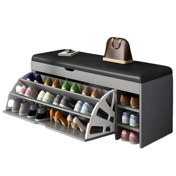 Blatul superior moale și tapițat transformă dulapul într-o banchetă practică, ideală pentru a te așeza confortabil atunci când te încalți sau te descalți. Compartimentele interioare spațioase sunt concepute pentru a păstra pantofii ordonați și ușor de găsit, menținând spațiul curat și bine organizat.