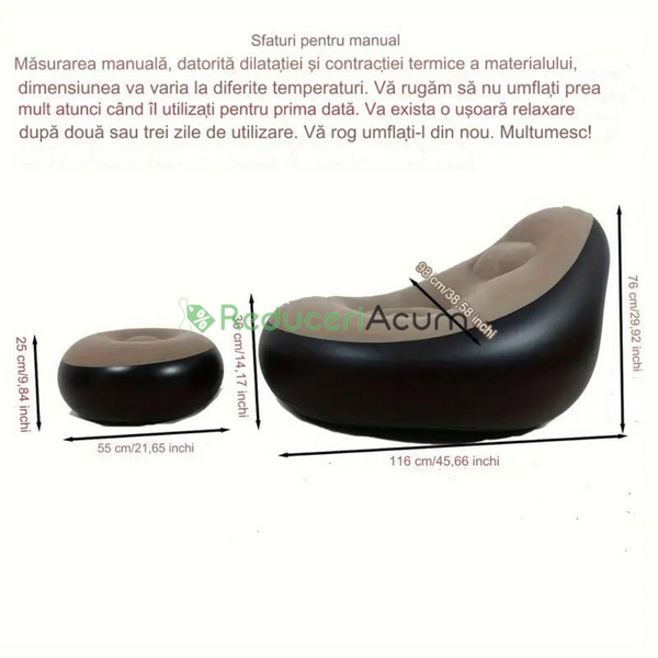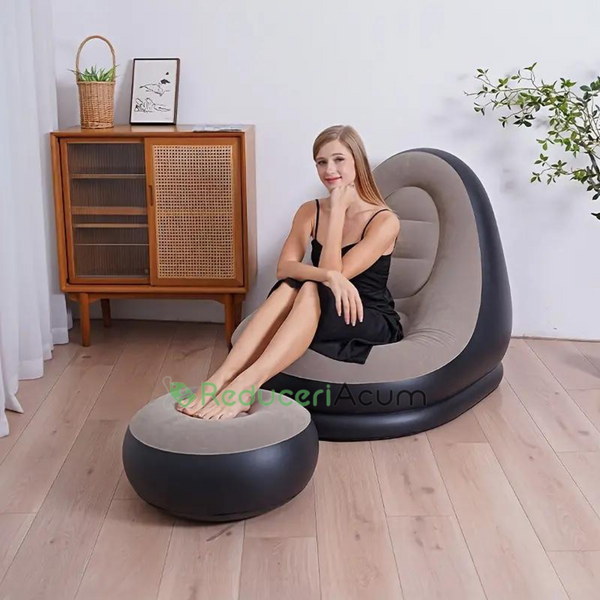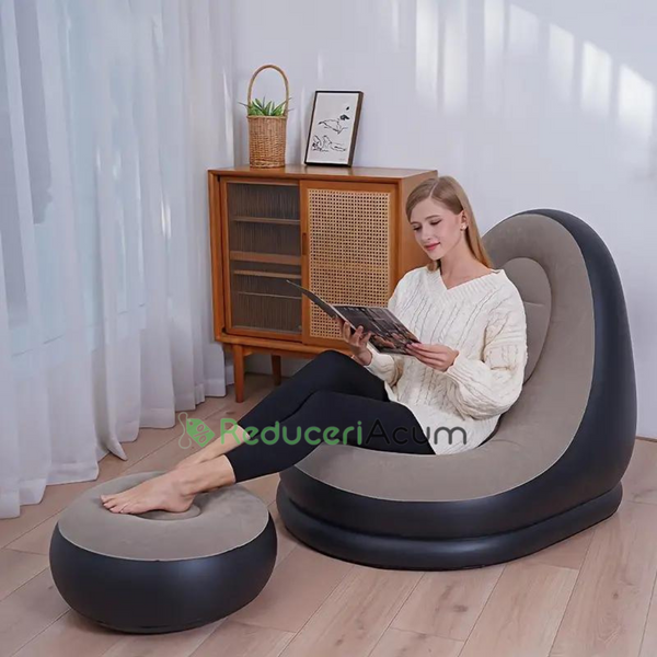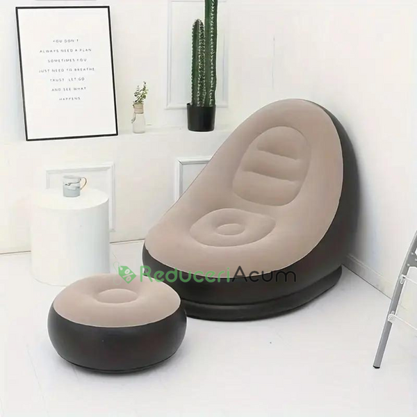 Versatil și portabil: Fie că îl folosești acasă sau îl iei cu tine în vacanță, acest fotoliu este ușor de dezumflat și compactat pentru a economisi spațiu. Ideal pentru spații interioare și exterioare.