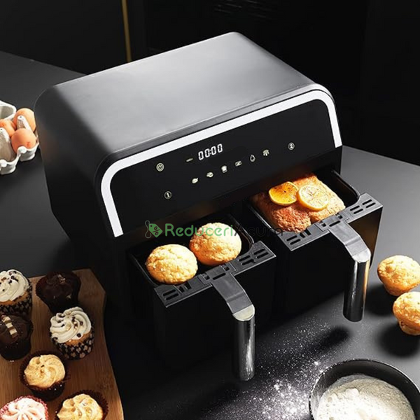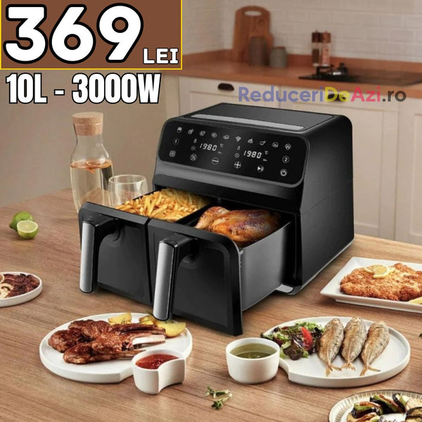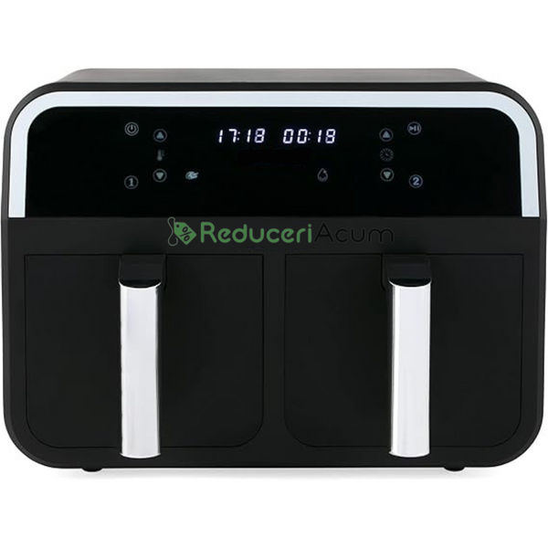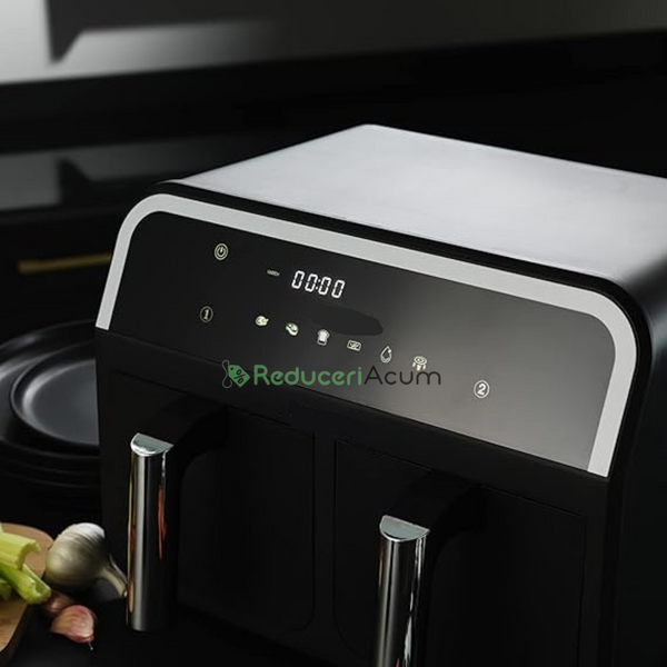 Friteuza cu aer cald TOP KING, 3000W, Cos Dublu, 9 litri, Termostat 80 - 200 °C, 8 programe predefinite, Negru