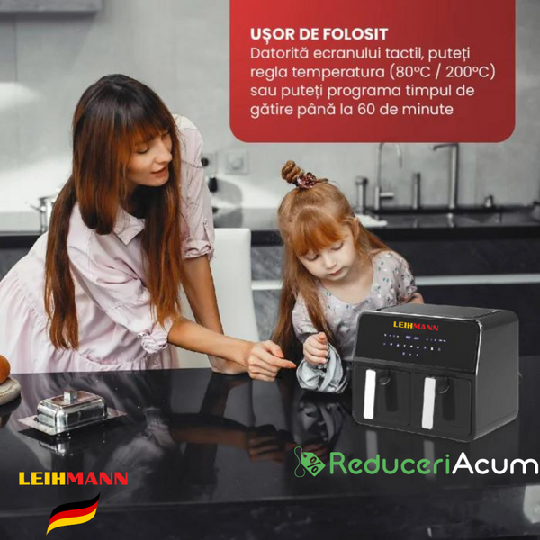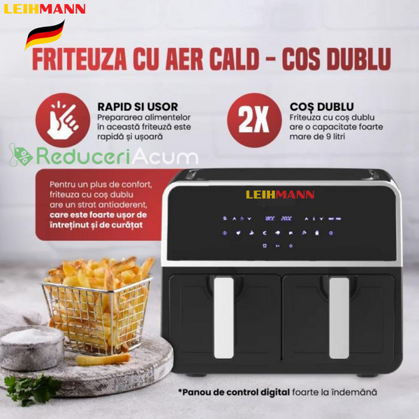 Friteuza digitala cu aer cald TOP KING, 3000W marca TOP KING face posibile prajirea, coacerea, gatirea si rotisarea unor preparate sanatoase pentru intreaga familie. Capacitatea sa de 2 cosuril de 4.5 L va da posibilitatea de a gati un volum mare de cartofi prajiti deliciosi si crocanti dintr-o singura utilizare. Cu friteuza noastră cu coș dublu TOP KING , puteți găti instantaneu de două ori mai mult. Astfel, puteți oferi imediat întregii familii cartofi prăjiți delicioși sau puteți servi un castron mare de crochete crocante în cel mai scurt timp. Astfel, nu trebuie să vă așteptați niciodată rândul și vă puteți bucura imediat de o masă delicioasă împreună.