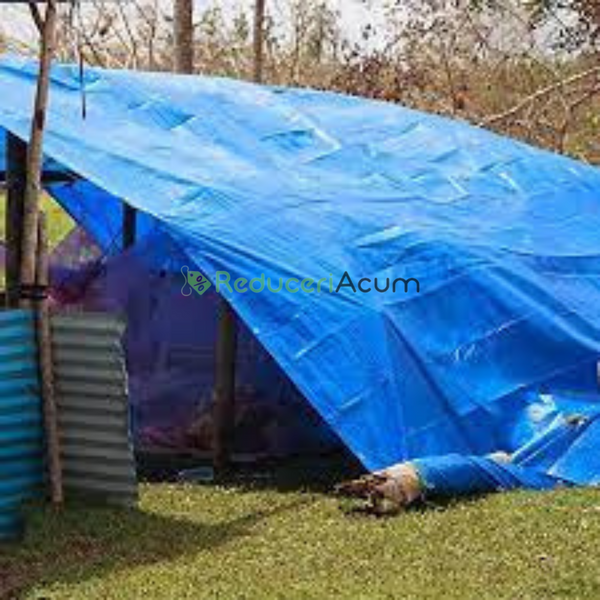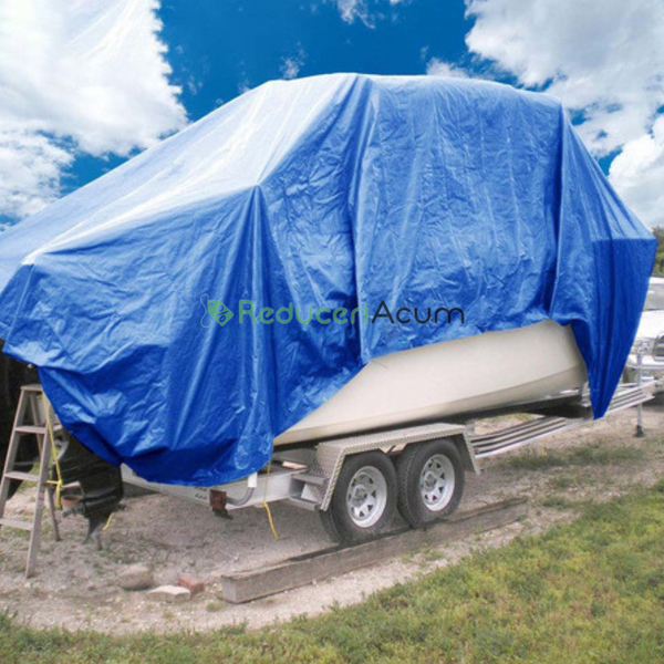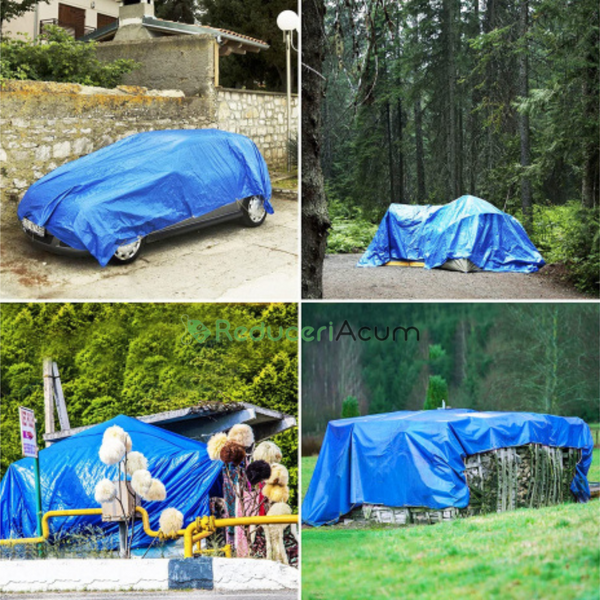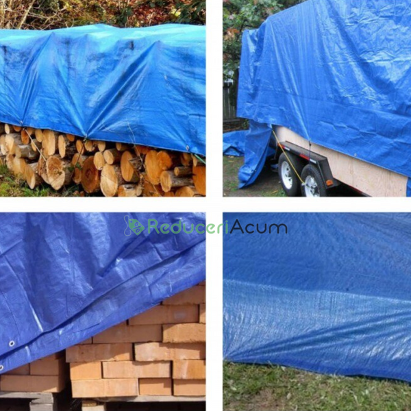 Prelata impermeabila, dimensiune 4 m x 6 m este rezistenta la inghet, UV, ploaie, deosebit de eficienta ca si husa de protectie pentru utilaje, autoturisme, gradina, materiale de constructii, depozite, hale.